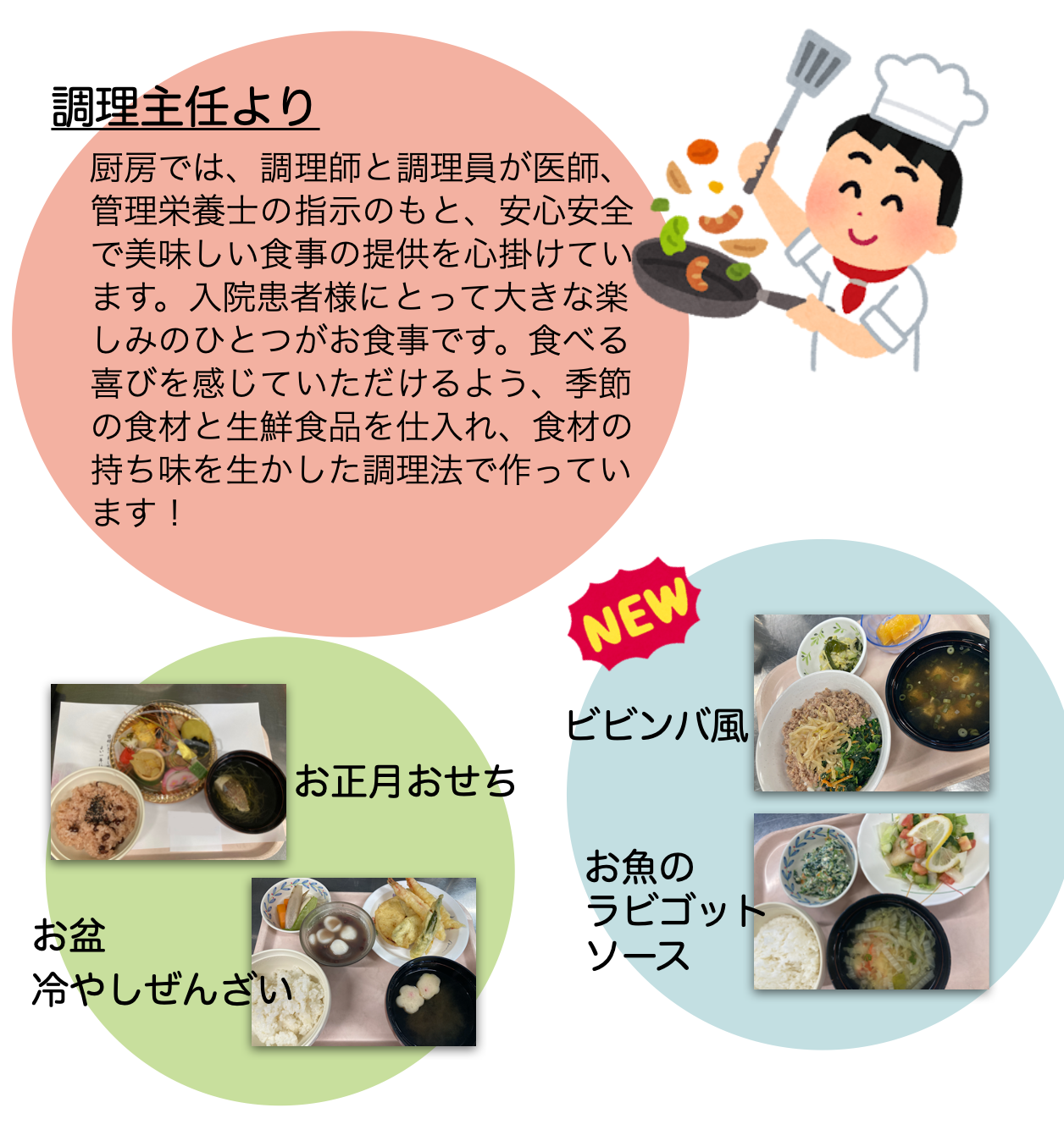 【医食同源】の意を大切に、医師を中心としたチーム医療の一翼を担い、患者さんの疾病の治療に貢献できるよう努めております。食事の相談役として、時には地域の話し相手としていつでも身近な存在でいたいと考えております。